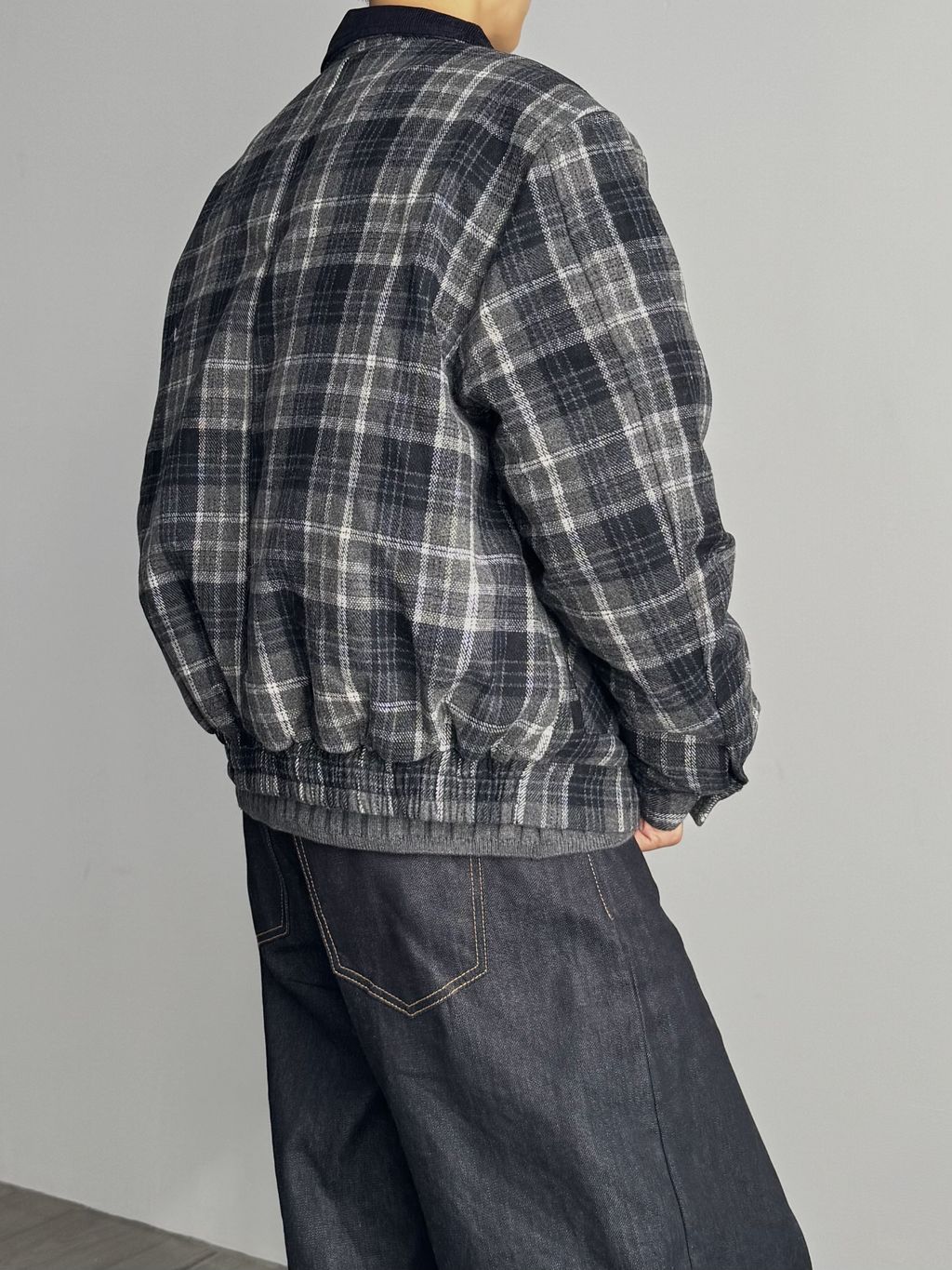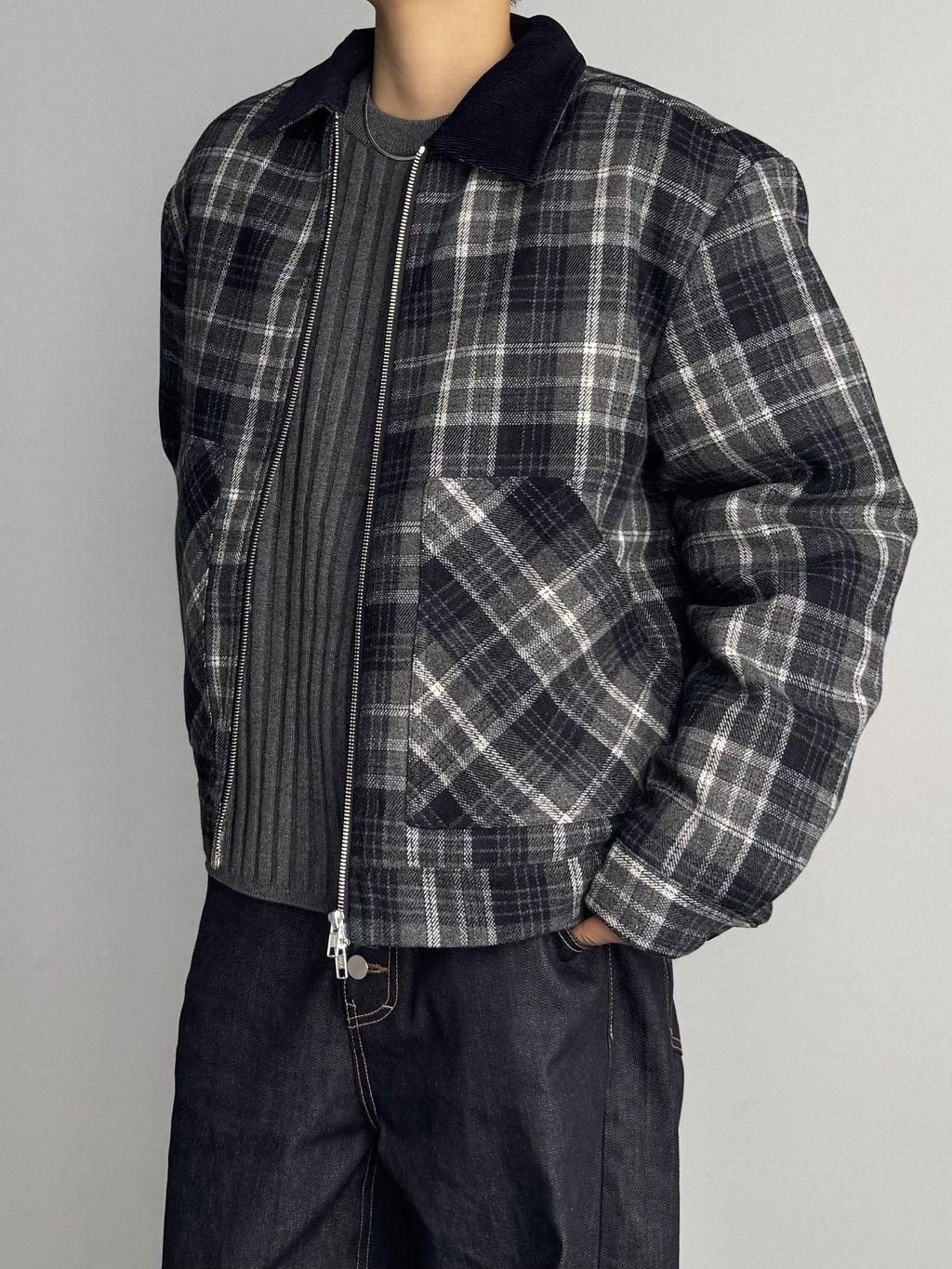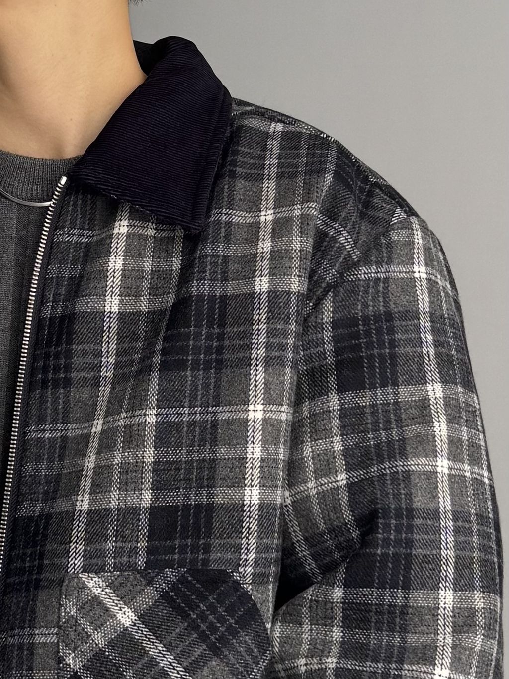燈心絨拼接領格紋外套