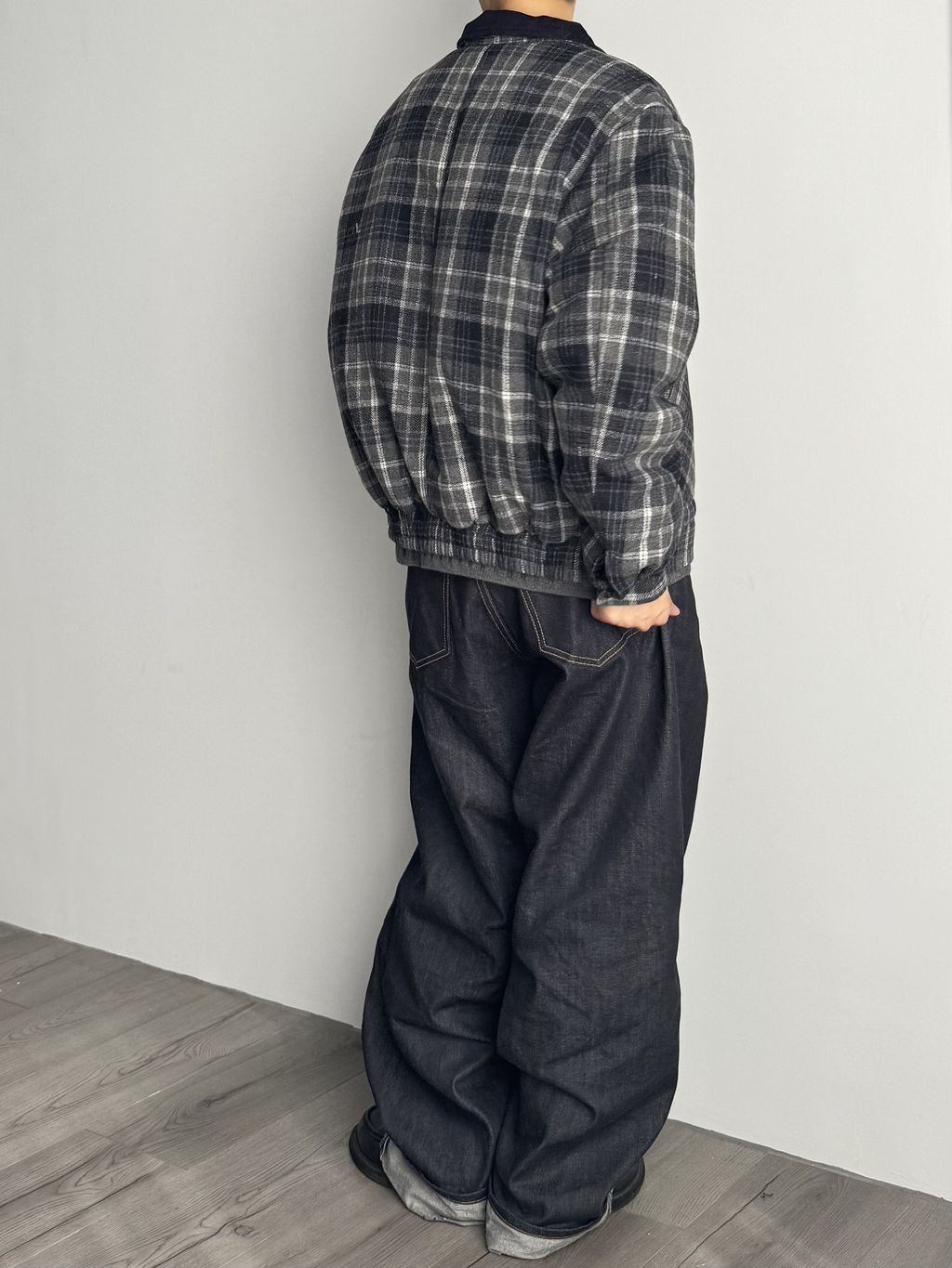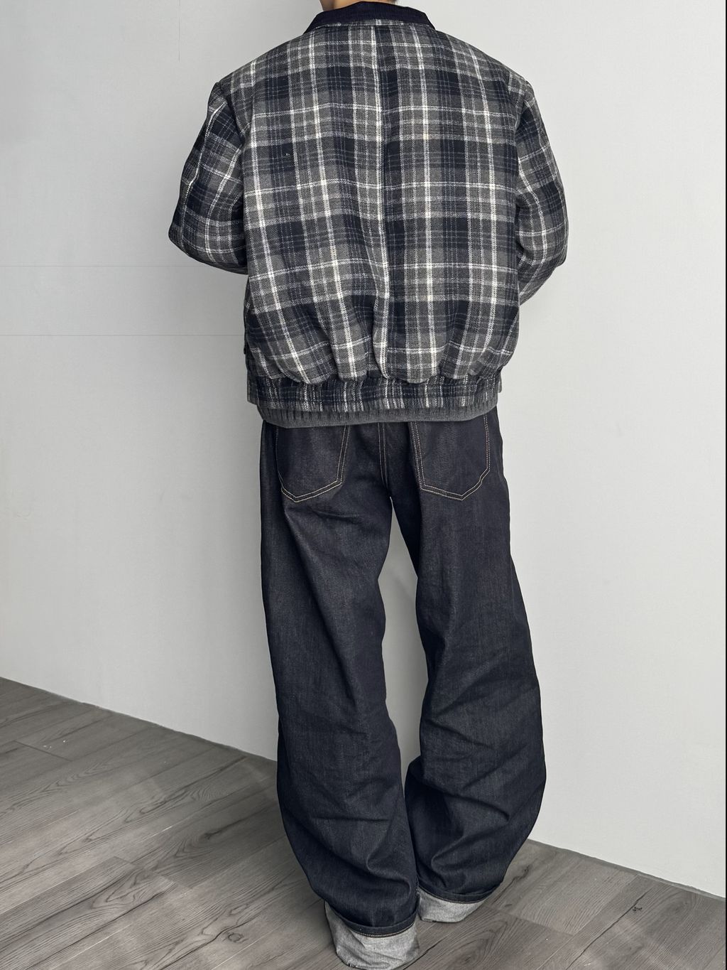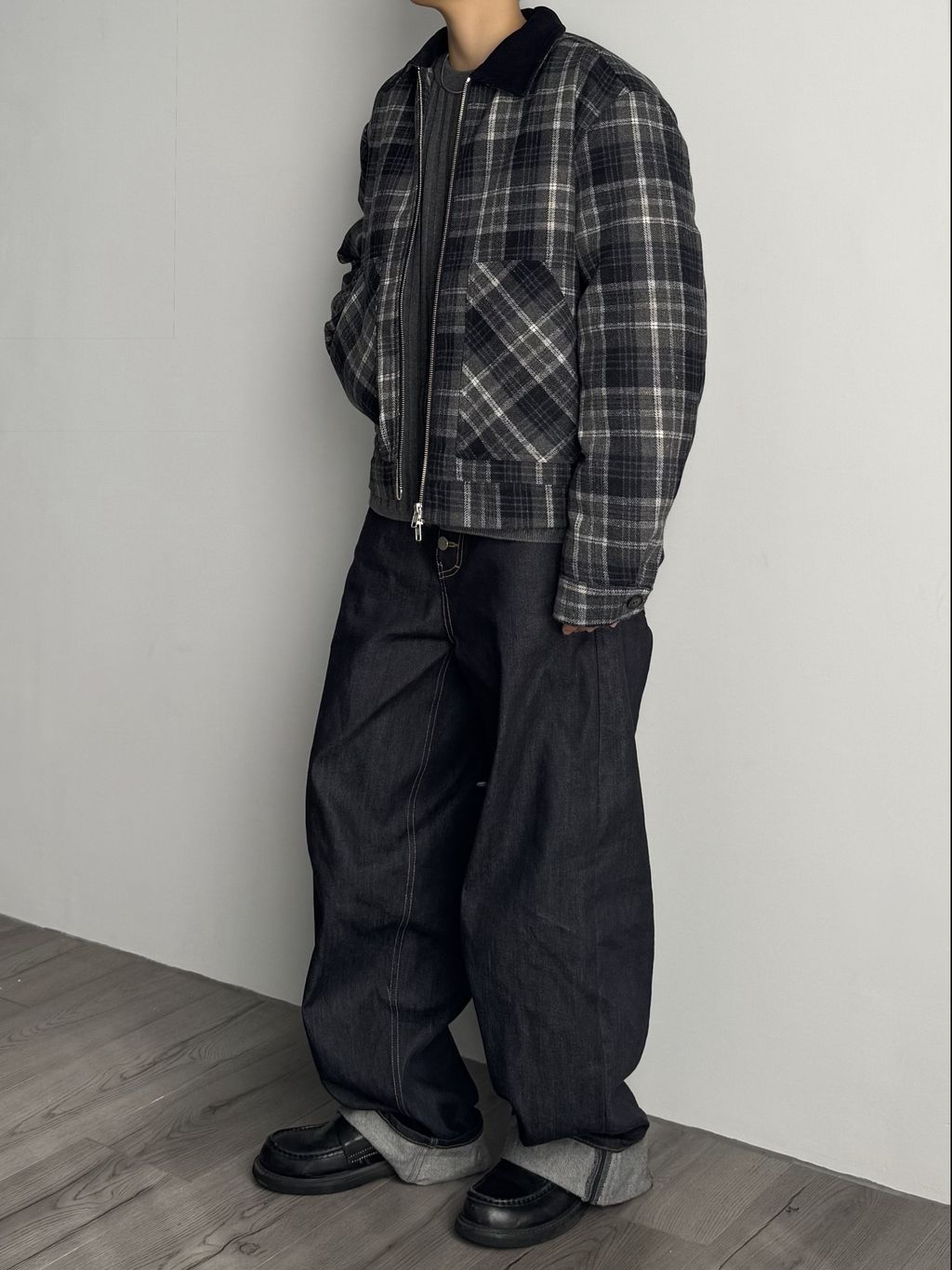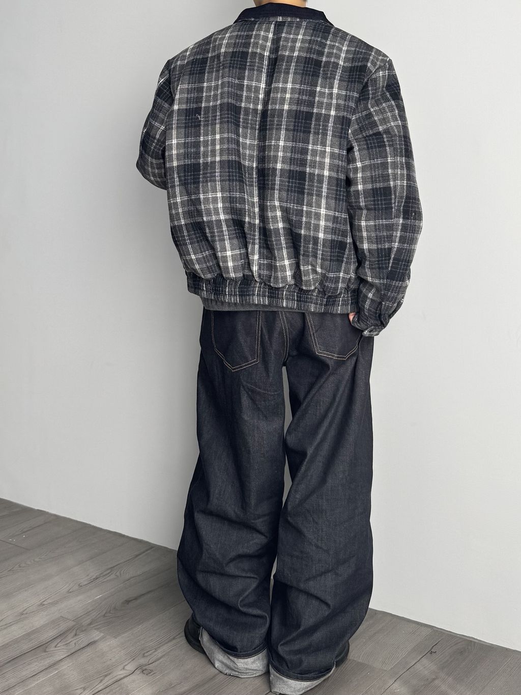 燈心絨拼接領格紋外套